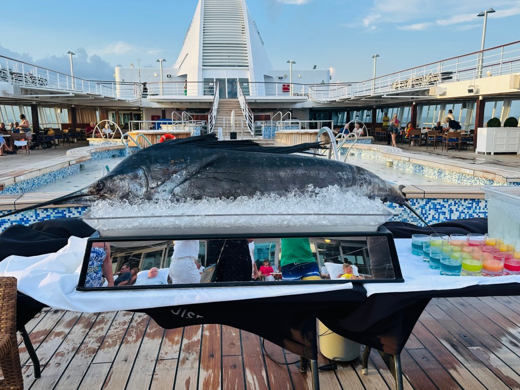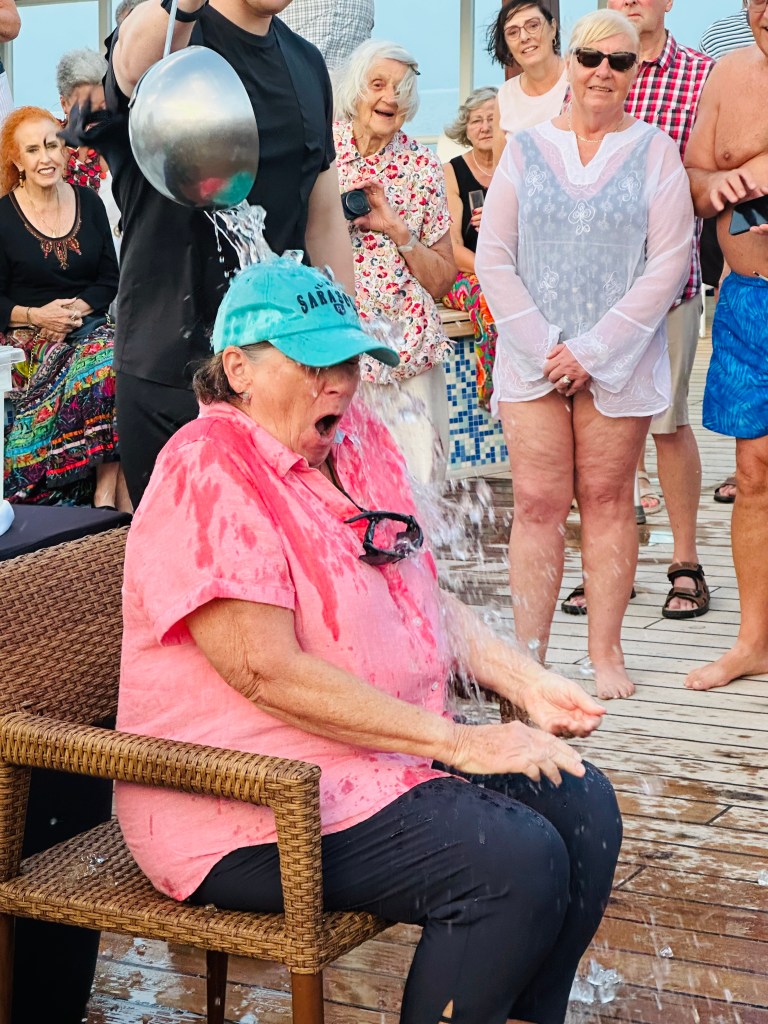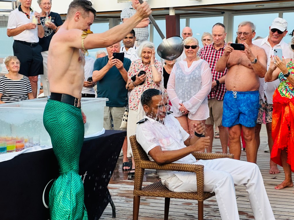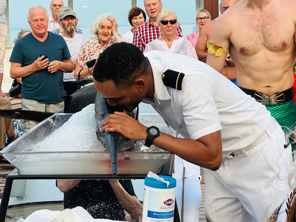 Neptune and his queen and subjects were on board. A huge Marlin that we had to kiss after a curtsy or bow to the king and then had some sort of potion and a huge ladle of ice-cold water dumped on our heads.