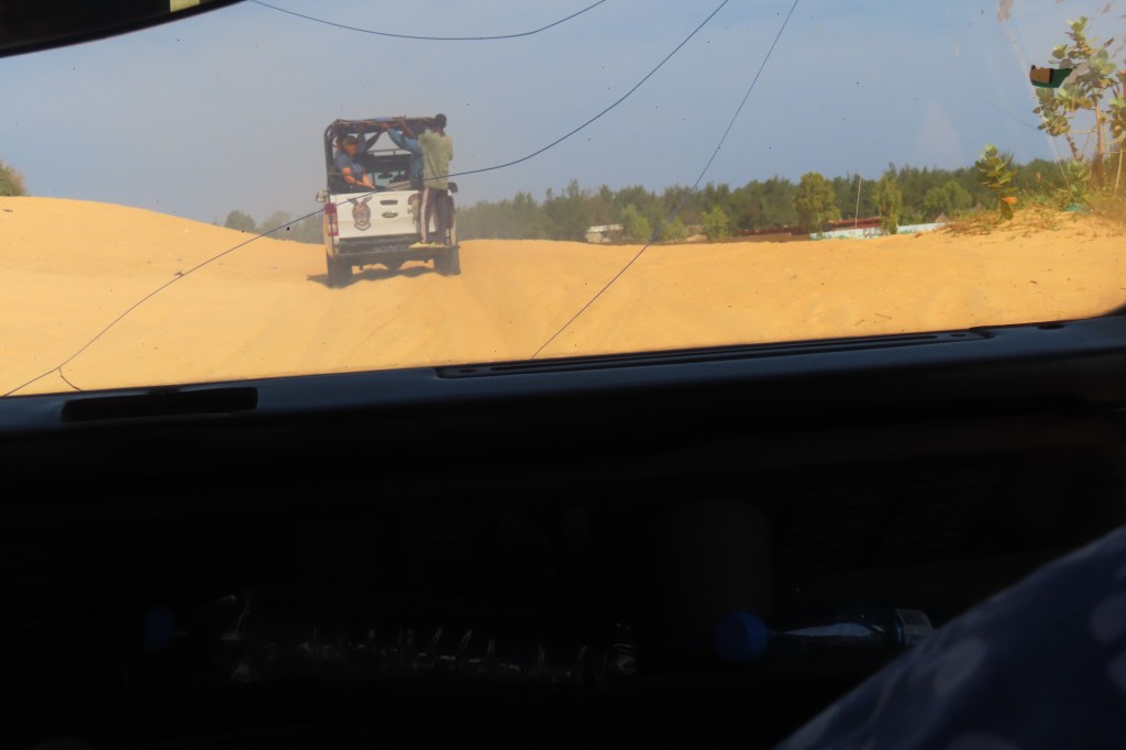 Due to climate change, Senegal’s pink lake is no long pink. It is a saltwater lake and they have had so much rain that it has desalinated. They are still able to produce salt and fish and at the same time they are trying to get rid of the fresh water and create a saltwater lake again which should turn pink again. Once we got to Lake Retba, we boarded 4×4 jeeps and open air small trucks to experience the bumpy ride on the sand dunes along the coast of the Atlantic. This was once the final stage of the “Paris-Dakar” car rally. It really was good fun!