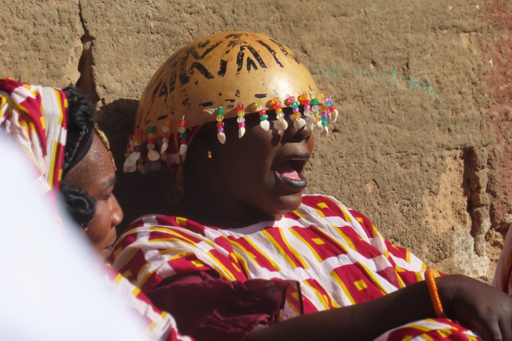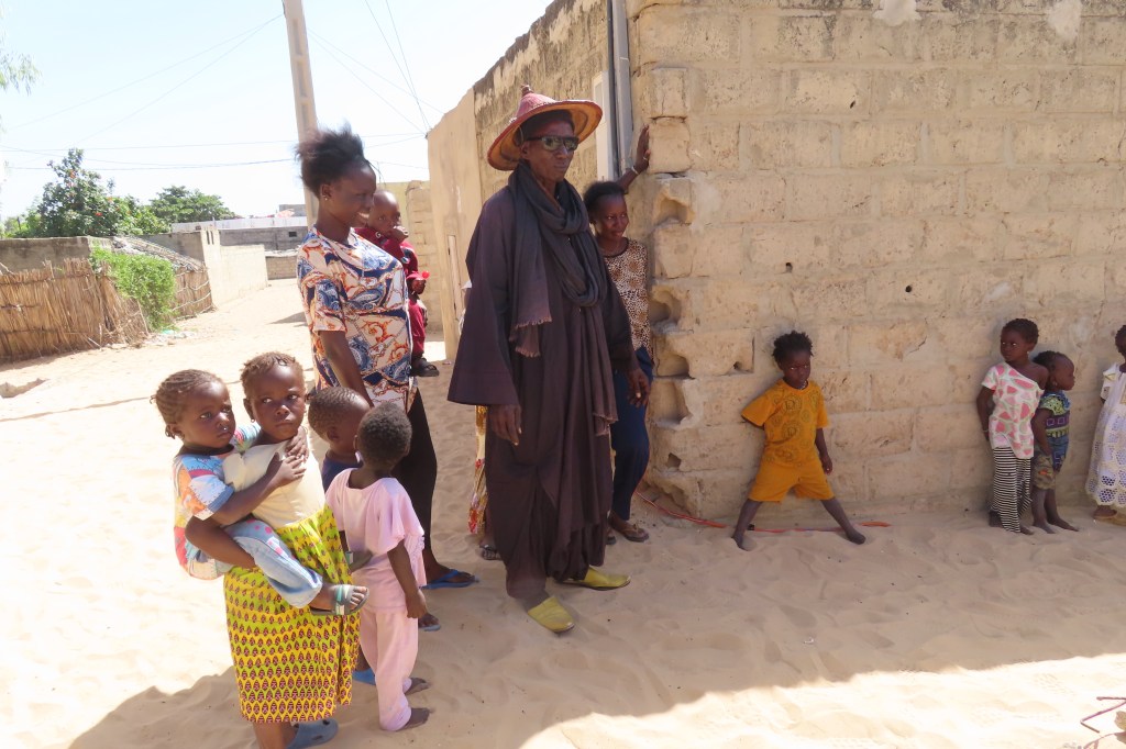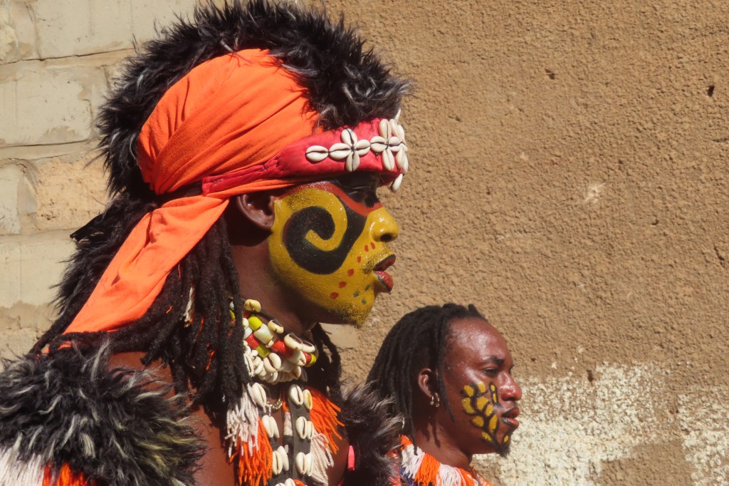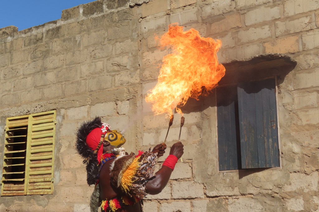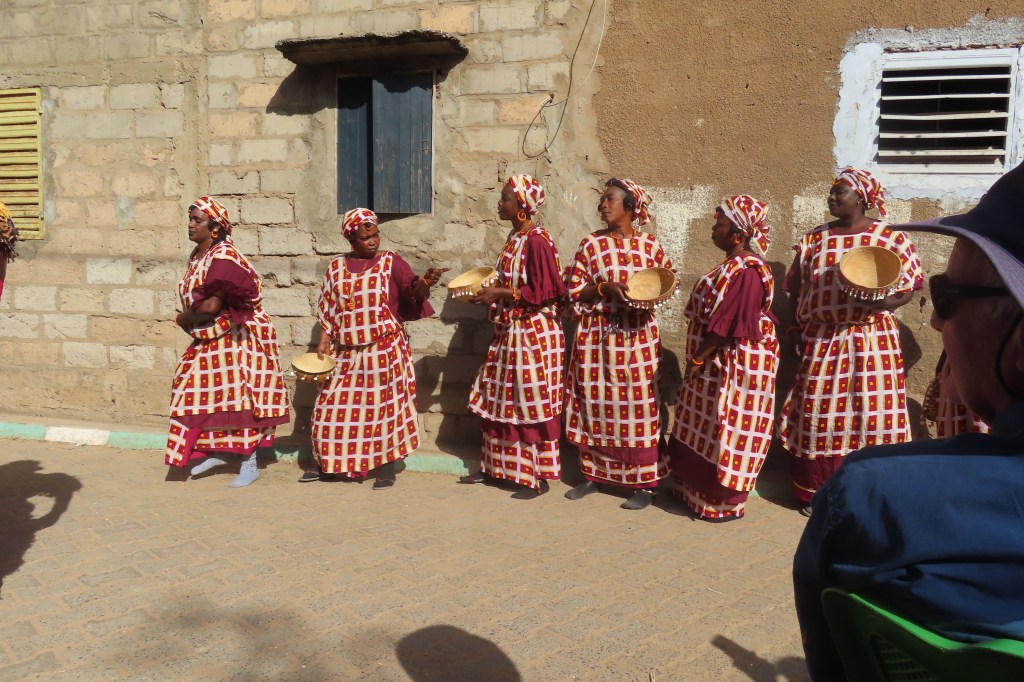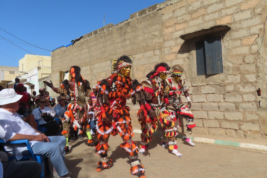 From there we went for a lunch at a resort style place and then on to the traditional Wolof village of Noflaye. We were greeted by drumming, music and locals from the village – there were chairs set up for us on a shady side of the street (it’s been very hot as we progress farther south). Young boys were on the roof tops and mothers and small children watching all of us and waiting for the festival dancing and music. We had no idea of what to expect but it was quite extraordinary and ornate. If I were to interpret the dancing I would say it represented determination, strength and a bit of intimidation. One dancer did some fire breathing…and there were women who dance in response to some of the men’s dances.