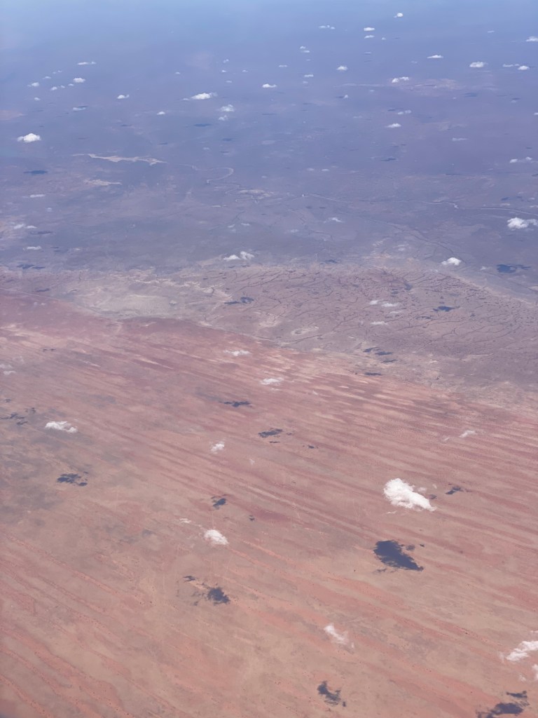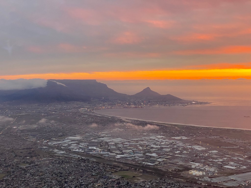 A few pictures of flying – coming over the Namibian desert and the sunset as we approached Cape Town and Table Mountain.