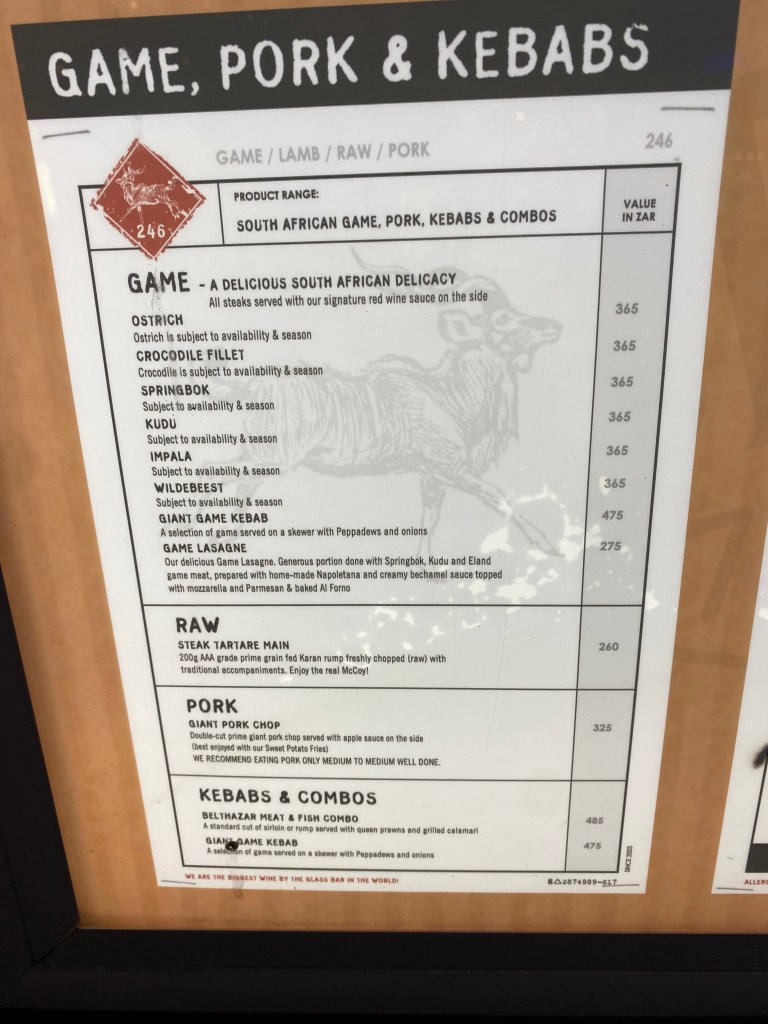 The game drive was wonderful – we had one in the morning, lunch, and then one in the afternoon. Our driver was a star and throughly loved taking us about the huge land area. There are strict rules about how many vehicles in an area and when something was found, the guides all communicated where different animals were but again, no more than two vehicles to stop and watch…The lunch was a traditional brei (BBQ) outside near one of the lodges on the grounds, with many meats, local dishes, salads and rice.