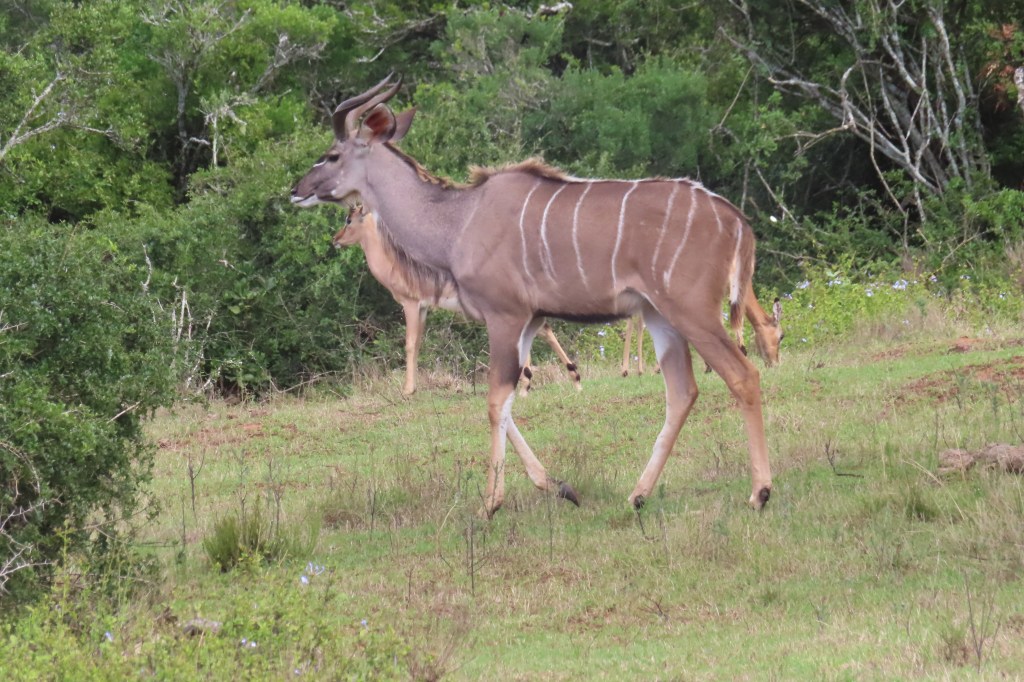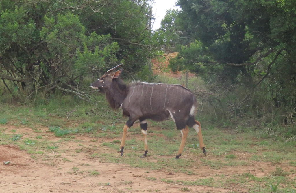 We saw so many animals – did not spot a leopard or cheetah but otherwise many that are some very common place and others harder to find. Two new ones for me were the kudu (never found on past game drives) and the nyala…there were several families of white rhino as well as some sleeping female lions and not too far away a male lion with his son – both resting (afternoon drive).