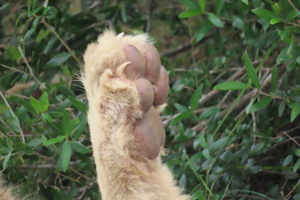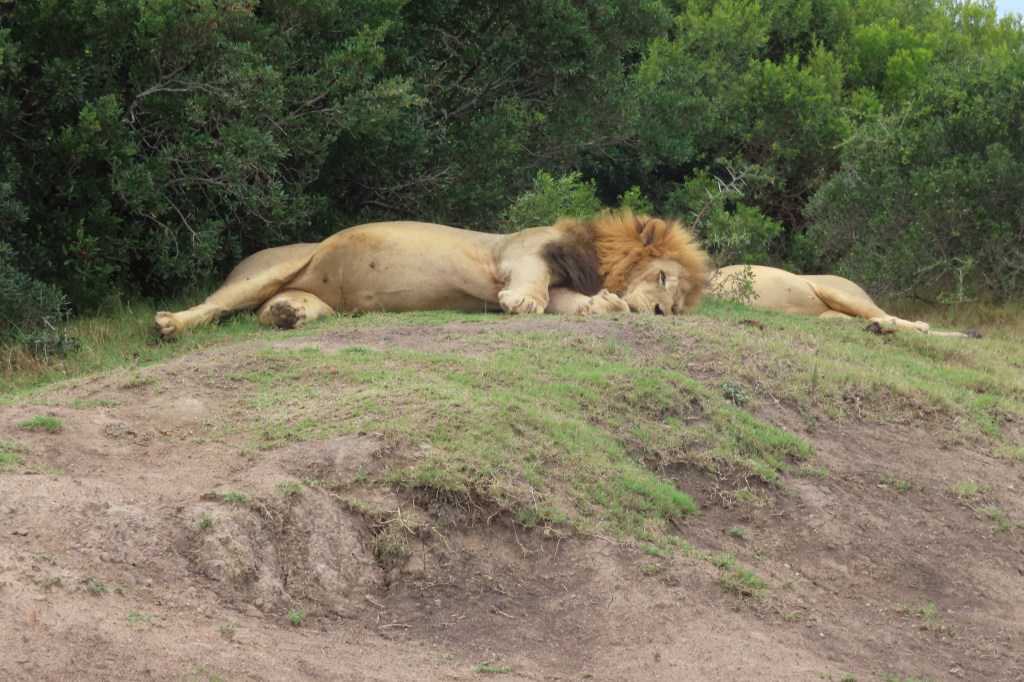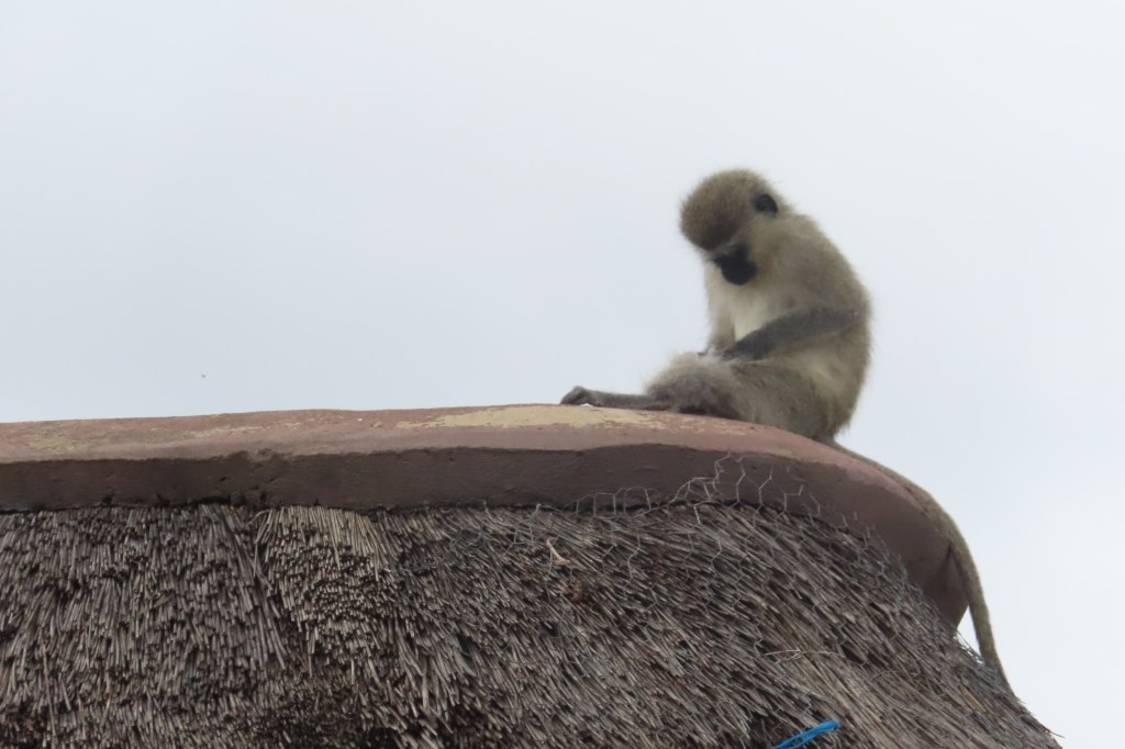 Lunch break in a boma, cheeky monkey on the building where the food was, solitary elephant, sleeping female lions – there were three of them. One sleeping with its paw up – so got a great photo of her paw!! Giraffe…there were two, male lion resting and same male got up to drink, after which he sauntered over and laid down with his son.