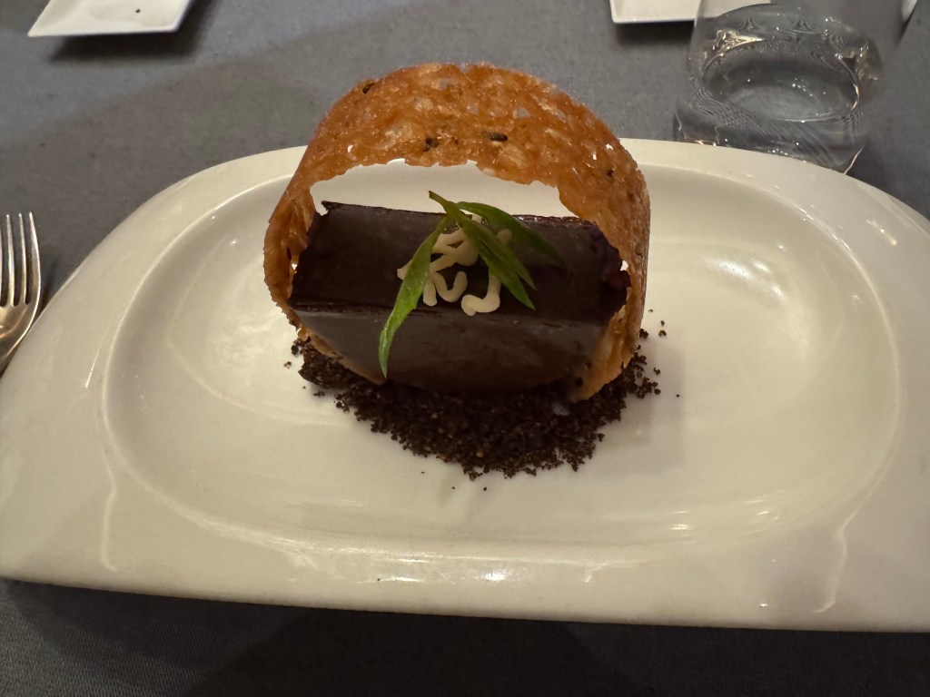 For dinner we joined a lovely group of solo/social travelers in the Pacific Rim restaurant…it was my favorite on the ship! Duck cofit spring rolls, Pad Thai and this beautiful dessert!