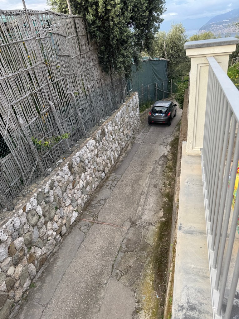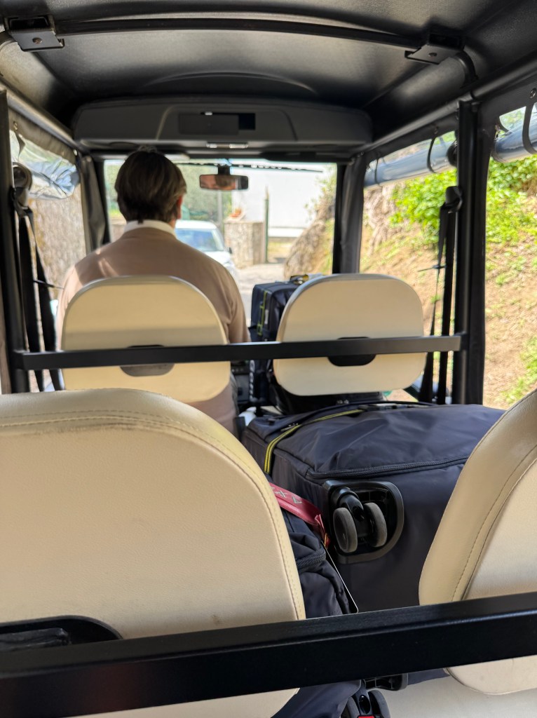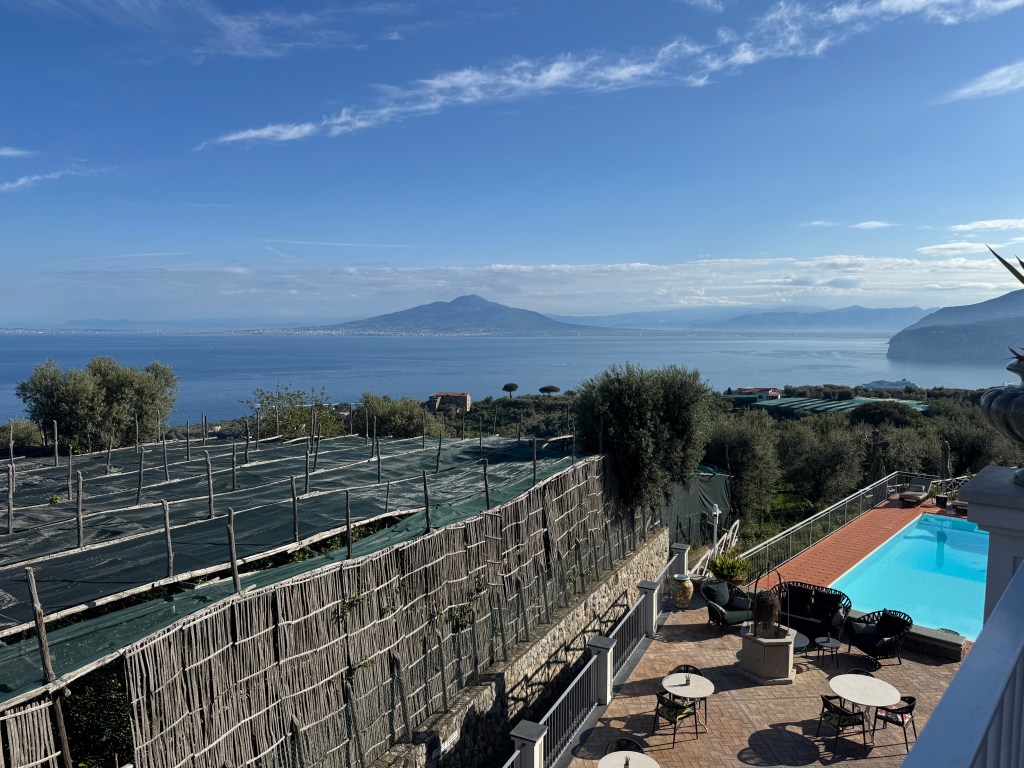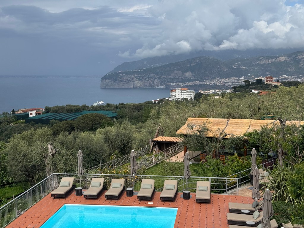Safely to Sorrento and area after three plane rides and a very picturesque, twisty turning trip into the hills of the Amalfi coast. Even the windows in the Amsterdam airport delight – Hermes.Beautiful views of the alps, Dolomites and Mount Vesuvius. Met at the start of the path up to our delightful hotel – with the golf cart, welcome drinks and a bit of a rest before dinner. All perfect.