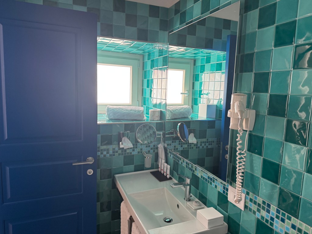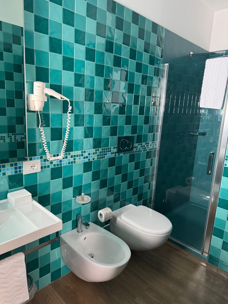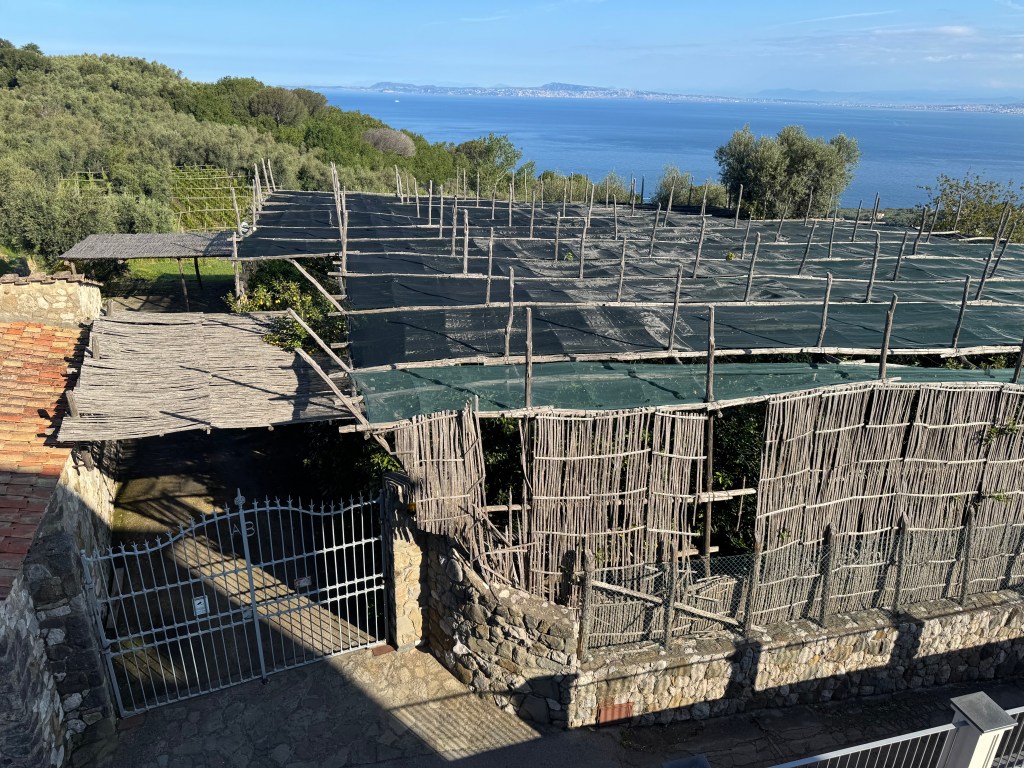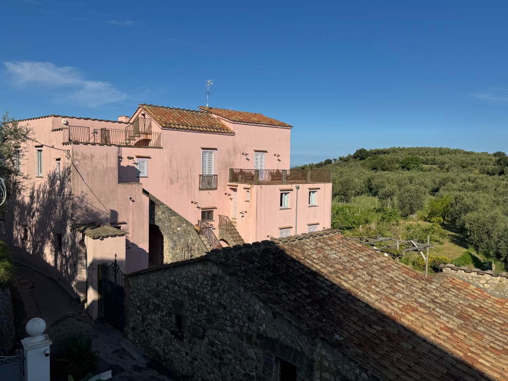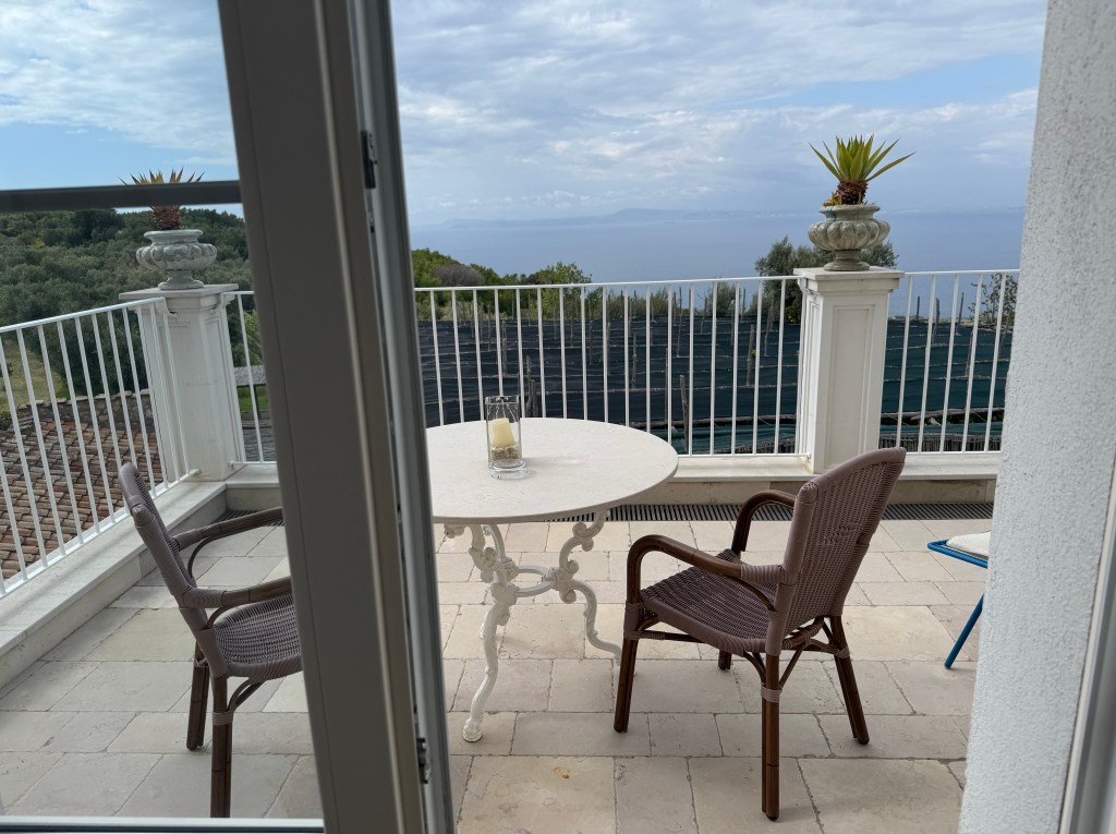Safely to Sorrento and area after three plane rides and a very picturesque, twisty turning trip into the hills of the Amalfi coast. Even the windows in the Amsterdam airport delight – Hermes.Beautiful views of the alps, Dolomites and Mount Vesuvius. Met at the start of the path up to our delightful hotel – with the golf cart, welcome drinks and a bit of a rest before dinner. All perfect.