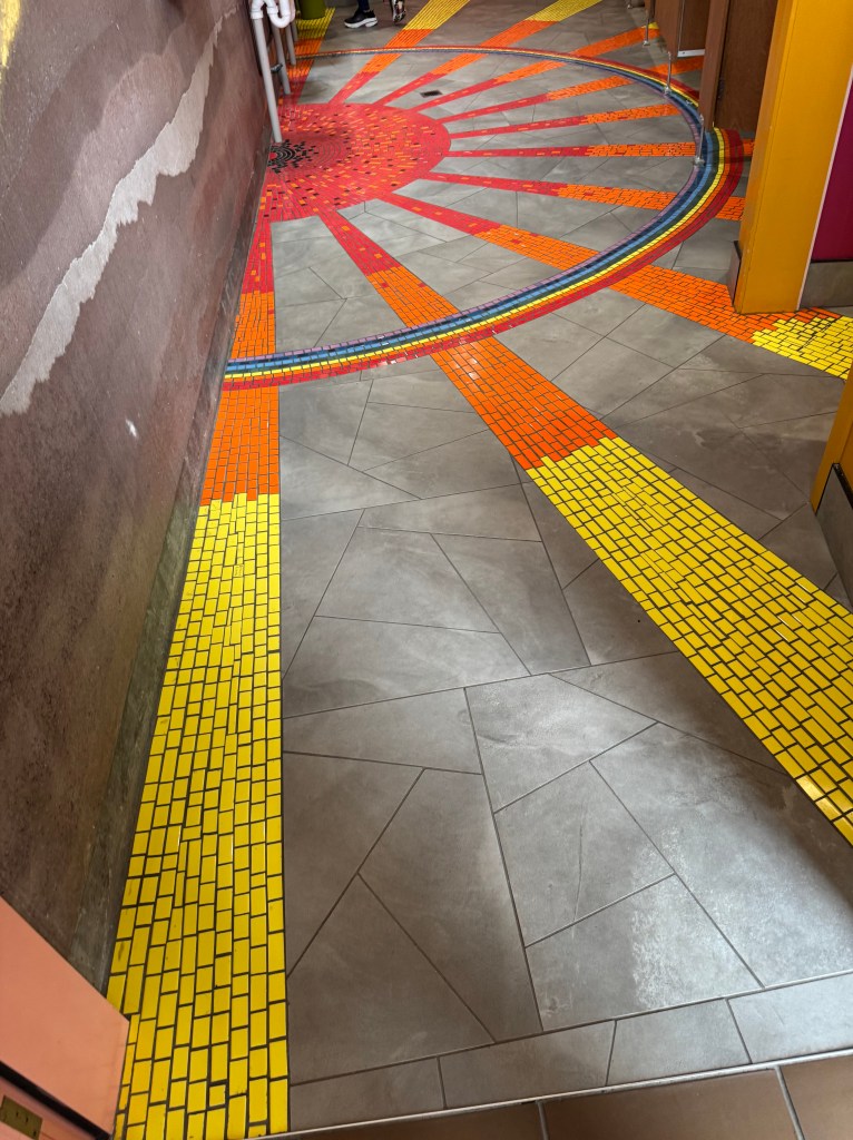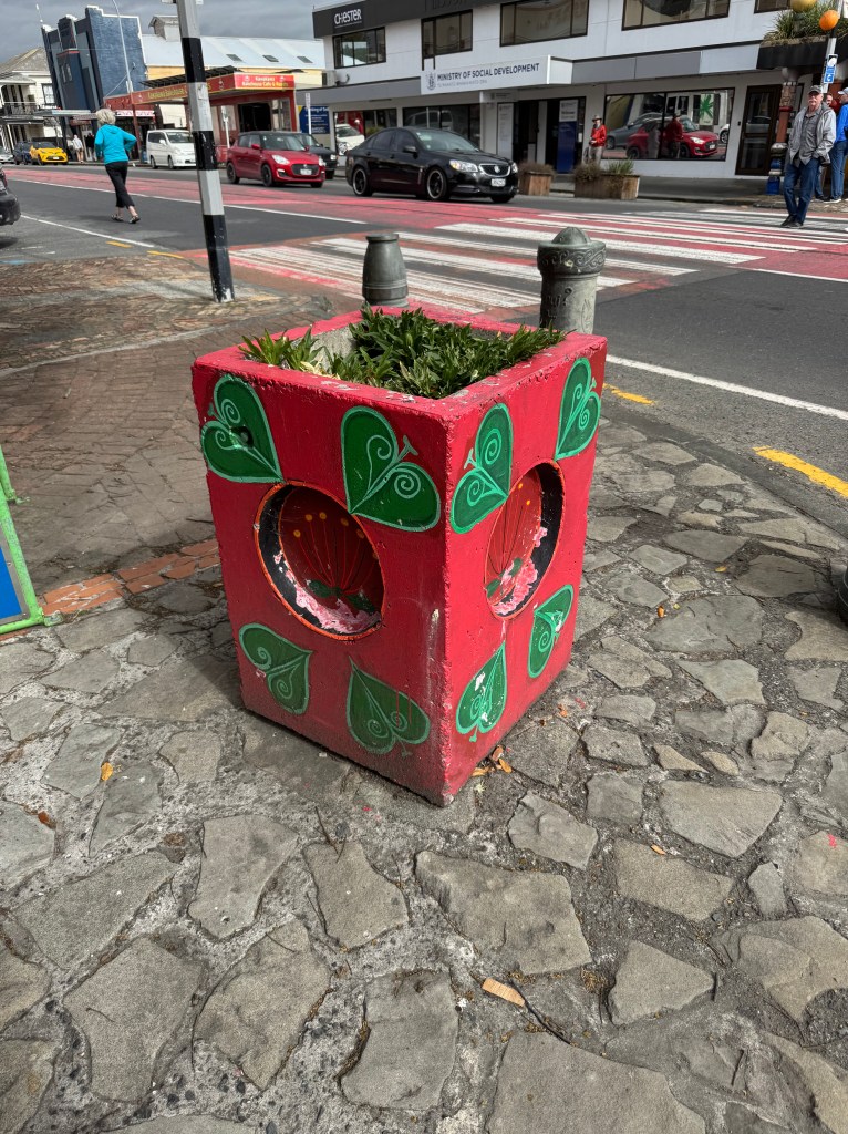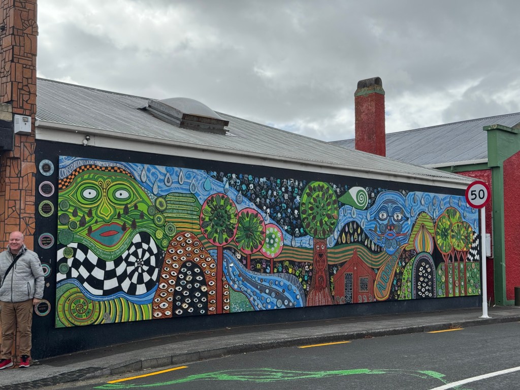 The unique bathroom decor of Hundertwasser Public Toilets and wonderful wall murals and planter. NZ seems to have a lot of murals – most very interesting with a story.