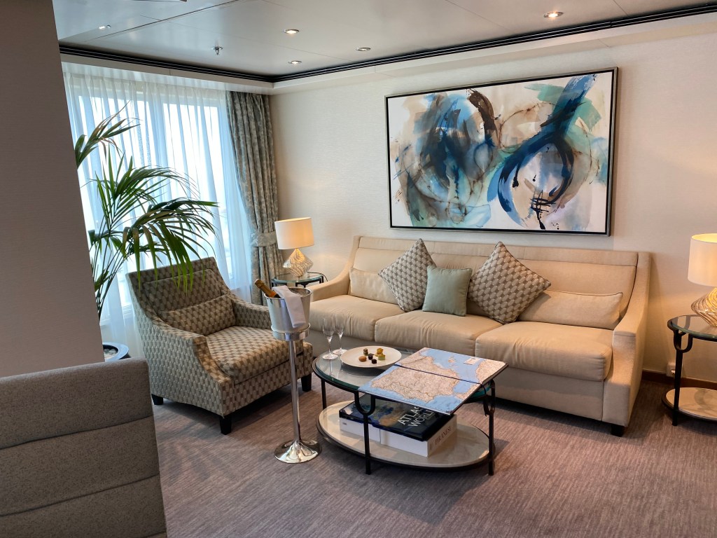 The speakers have been good and other guests are very friendly sharing stories of past cruises or an excursion. We are enjoying our suite life with periodic canapés, a full bar, and truly anything we might request. Will add a few more pictures of the suite…it’s called a Voyager Suite. About 650 sq. Feet and 1.5 bathrooms. No complaints!