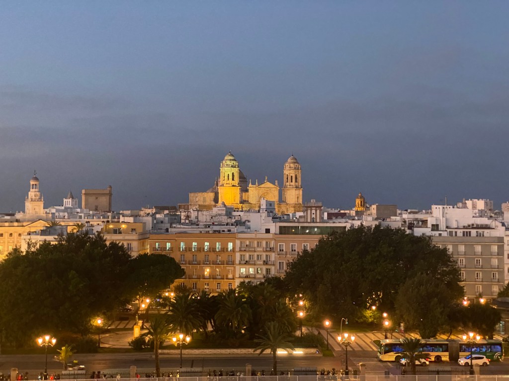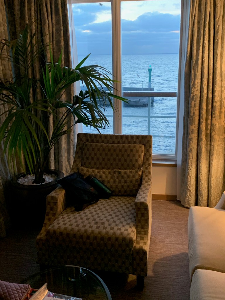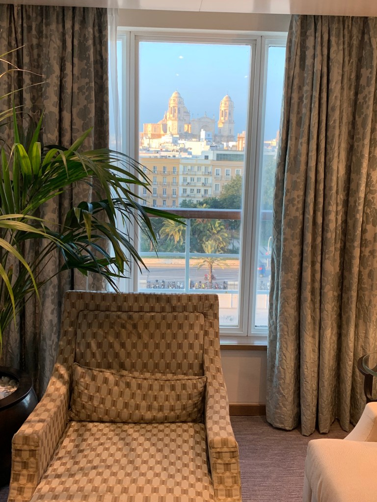 We met a bunch of “solo” travelers yesterday and had dinner with them. The cruise line helps to organize this. Delightful! Today, we will be hanging out with the bridge players as it is a sea day. We are sailing our way over to Cadiz, Spain at the moment and can see mountains afar. Calm, quiet seas…breakfast in the suite, and thoroughly enjoying everything.