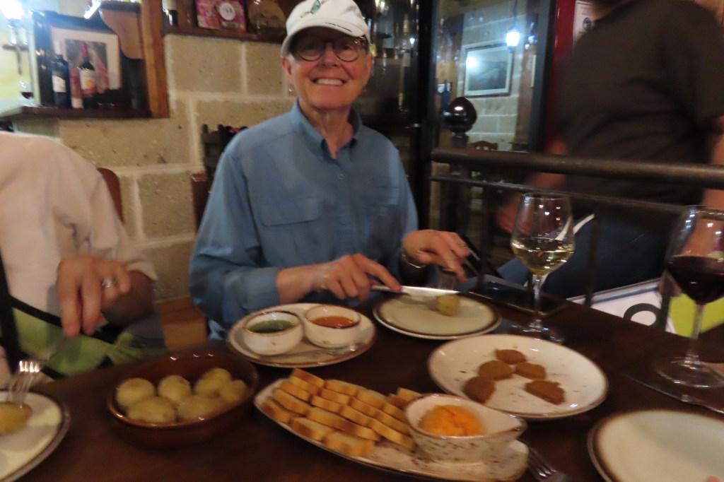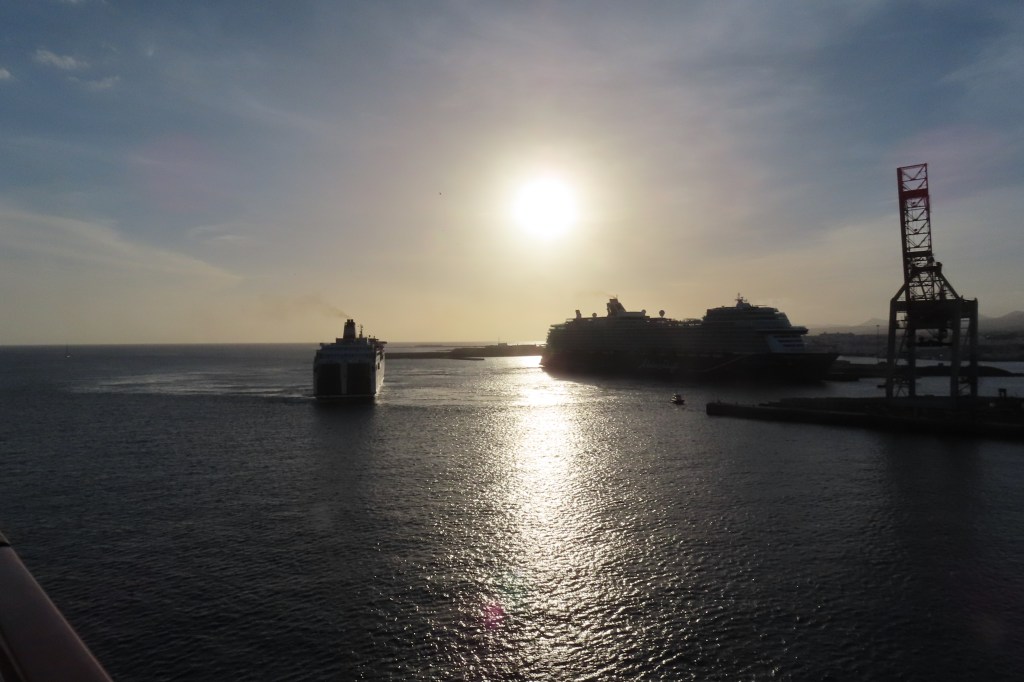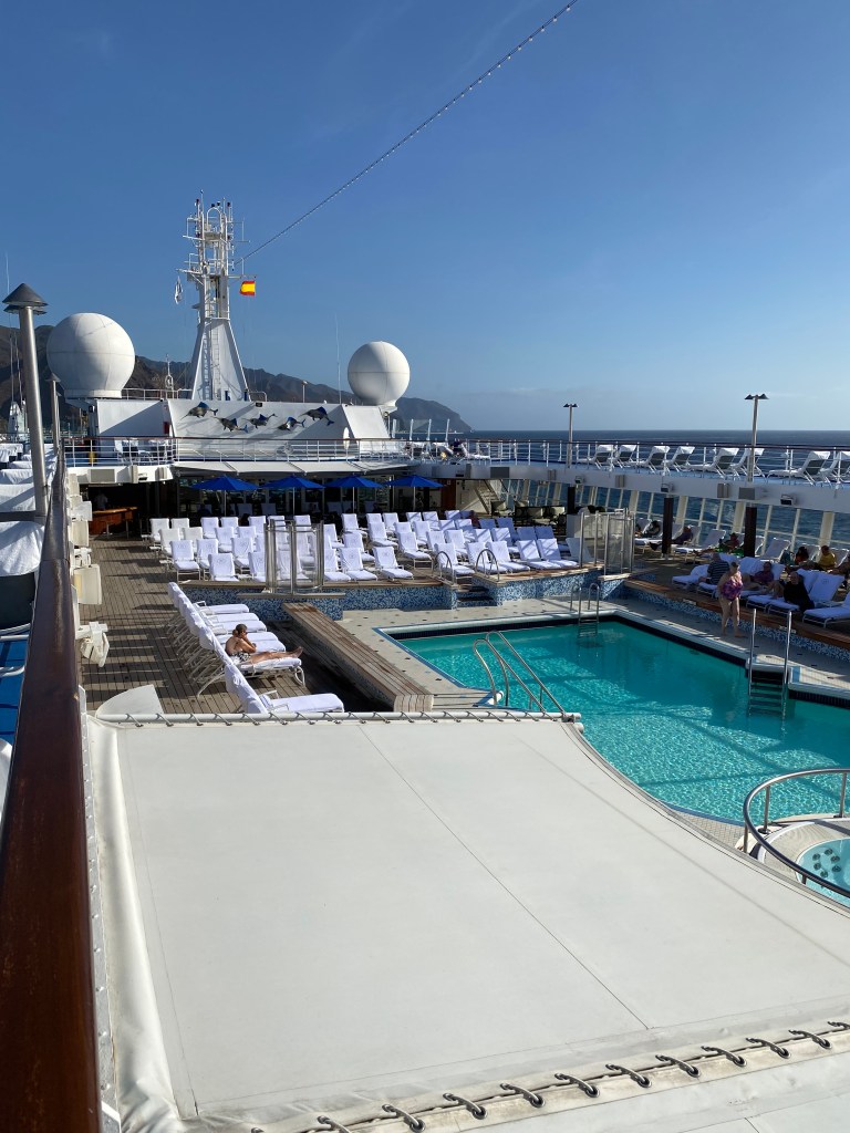 After the Canary Islands we had two fun sea days…they have picked up a pattern of breakfast in the restaurant, Bridge class, lectures (all excellent), lunch, rest time and then mid-afternoon needlepoint with a beverage and lots of chatter in the Observation Deck Lounge… yesterday we did see a couple of humpback whales thanks to our Captain letting us know… one of those scenes where everyone on the boat runs over to the port side deck to watch. Typically we meet again at 6:45 with our Solos group and have dinner together – always with lots of frivolity…