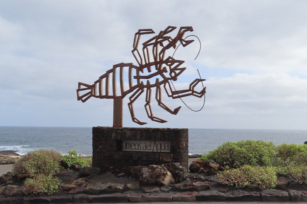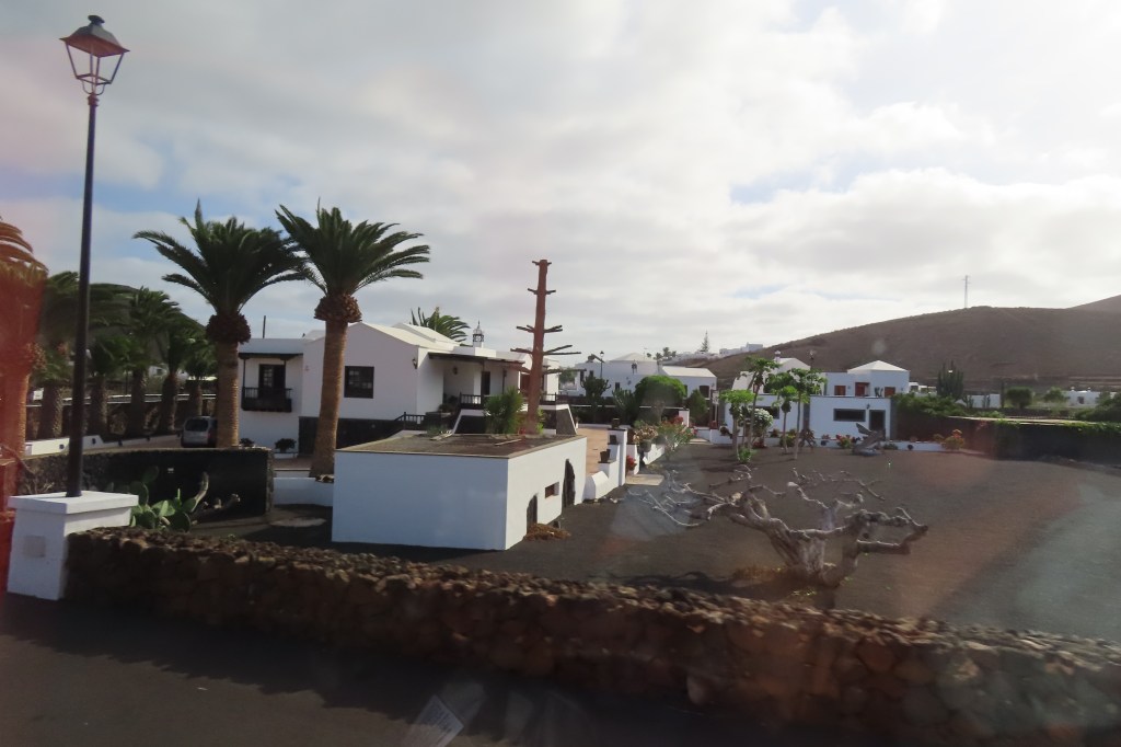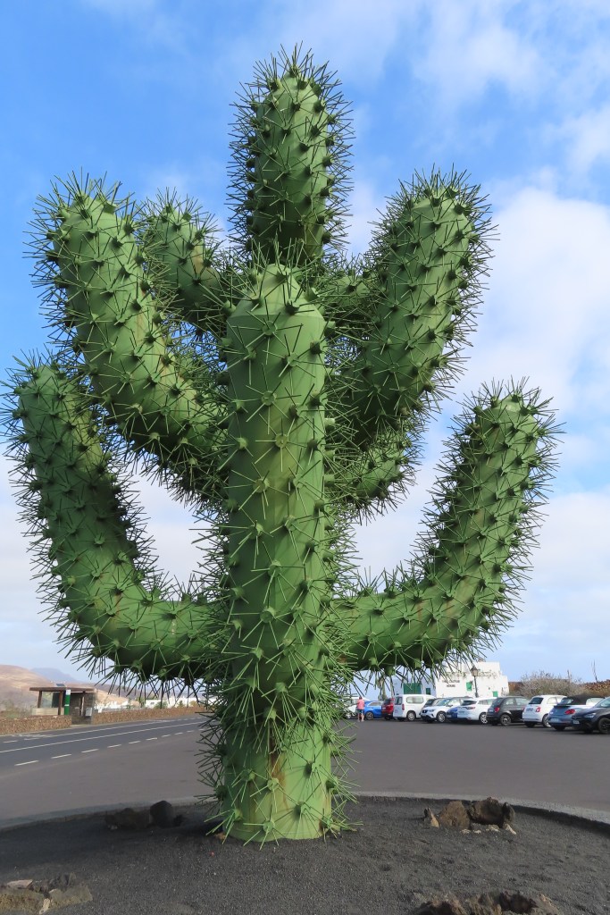 Our excursion on Lanzarote was quite the tour – visiting a cacti garden with over 1500 species of cacti. The islands get about 5” of water a year and their zero scape is beautifully kept lava gravel. There are no natural trees tho’ we saw a few palm trees as decor. That said, the clouds are very low in the area and thus also drop a mist as well as creating a lot of humidity. The guide was excellent and offered a lot of information about life on the island being very communal and everyone taking care to keep the island and life very friendly amongst the 150,000 living on the island. Other than the black gravel in the yards there were boulder fields of lava along the road and then plots of cactus plants to produce a parasite they collect to make the natural red dye in everything we use or consume – from make up to food coloring. The houses are lovely white with either green or blue shutters and trim.