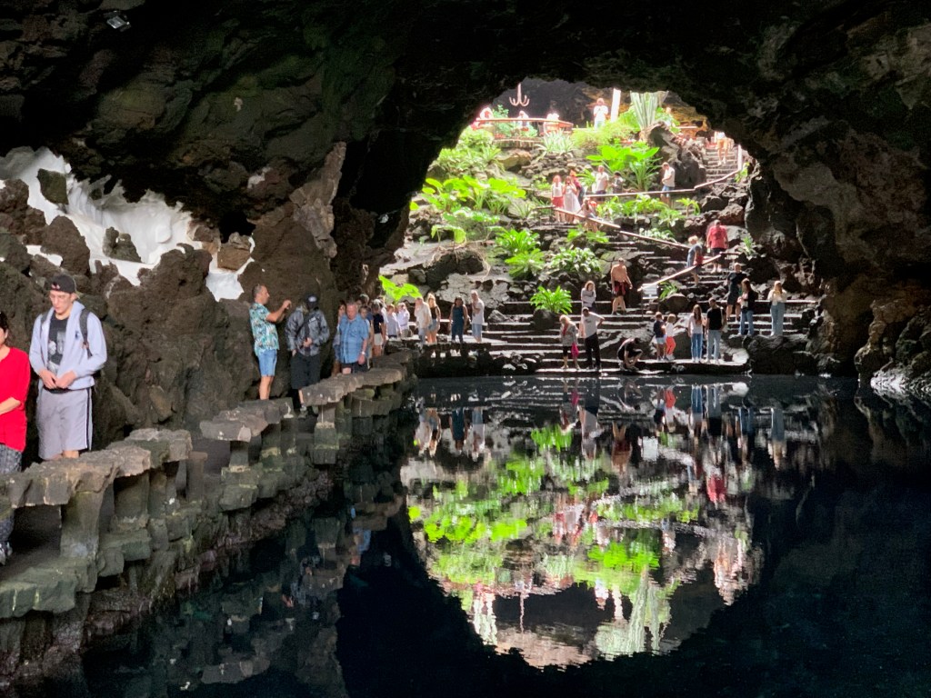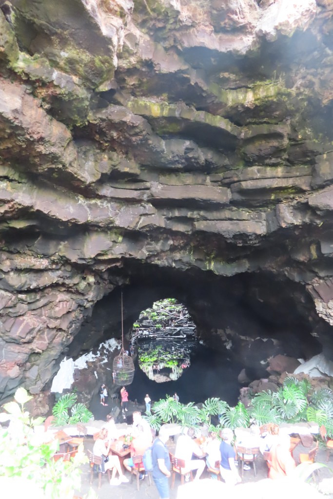 The second part of the tour took us to an amazing lava cave…Jameos del Agua, a complex area of lava rock, tunnels, and caves where the owner had created a restaurant, theatre, beautiful grounds above the cave/tunnels and it included a tidal pool with tiny little crabs. The stairs and ground were a bit of a trek due to the uneven blocks of lava but well worth the visit.