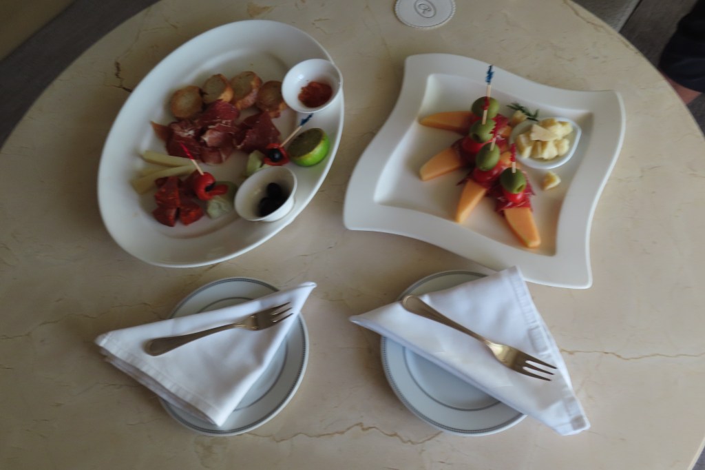Some mornings we eat in the suite and others we wander out to the many other options. Last night after a late lunch out in a cave (will post that excursion tomorrow!) we just had canapés in the room and then drinks with our little group, before the show. Tonight our excursion has us going ashore in Santa Cruz for Tapas tasting – a Thanksgiving first!