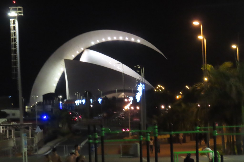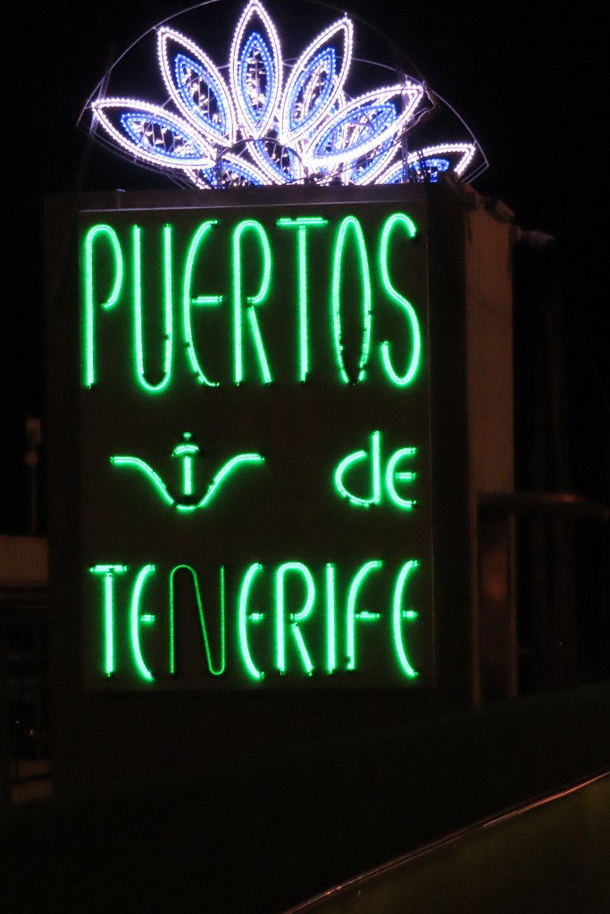 Our second day was in Santa Cruz de Tenerife and it is the most populated island with a lot of vibrant culture, typical European squares, eating outside and people out for a meet up with neighbors and friends in the evening. We took a late afternoon excursion for a walking tour through the city to hear about historical buildings, architecture (the Opera House much like the one in Sydney, tho much smaller), etc. Residents are strongly Catholic and celebrate Three Kings Day in January and the city was amass with holiday decorations and a delightful park with a holiday video showing for families on a Friday night. We took the tour to hear about all this but sadly the guide, as much as he tried, was not up to any standard for guiding…the other part of the tour was for some wine and tapas tasting – both of which we did but again, sadly, with no info or explanation, With this rather disappointing experience we still had a delightful evening with some people we’ve met on board…good laughs and stories!
