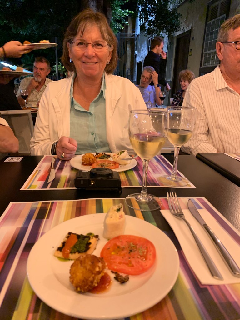 As “solo” travelers on this trip the Social Director, Kelly, organizes a lot of nice extras. One is meeting in the bar on the Observation deck at 6:45, have a beverage, and then anyone interested goes for dinner. It’s really quite fun and we have a great group of solos. One night Kelly ate with us and another night Olly and Jackson hosted dinner – one a dancer , whose mom was a Radio City Rockette, and the other a singer, both with the entertainment crew. Delightful young men…we went to the show last night to see them after being requested to sit in the front row… they said it helps to see friendly faces!! Two nights ago Kelly and Ugo (the general manager) joined the solos for dinner – he hosting with two excellent bottles of champagne as a treat with dinner. Needless to say we are enjoying the extras of being solo and getting to meet those running the show, in one way or another! The frivolity at dinner is quite fun. We choose to share a table at the specialty restaurants and have thoroughly enjoyed that as well…sharing tables in Europe is a norm, and can be a lot of fun. I wonder if Americans will ever move into a more inviting behavior as such.